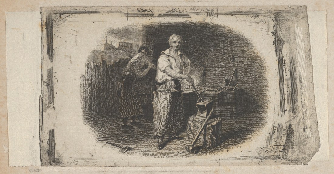 [i] Banknote vignette with a blacksmith and forge, ca. 1824–37 American, Engraving and etching on chine collé; plate: 1 7/8 x 3 1/8 in. (4.7 x 8 cm) sheet: 3 7/16 x 5 1/2 in. (8.8 x 14 cm) (The Metropolitan Museum of Art, New York, Gift of Joseph Veach Noble, 2002 (2002.333.16) http://www.metmuseum.org/Collections/search-the-collections/393945; accessed 18 Feb 2023).