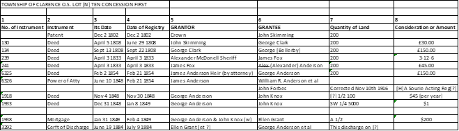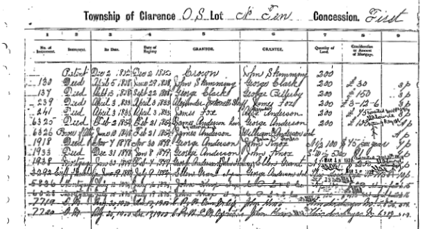 [iii] Ontario Land Register, Historical Abstract/Parcel Registration Book, Clarence, Russell (50) OS Lot 10, Concession 1, Images 156-7. Accessed on https://www.ontario.ca/page/overview-land-registry.