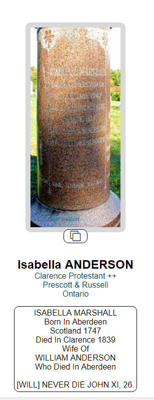 Another person who came with the Andersons in 1832 was Isabella Marshall. At least one descendant has stated that Isabella was George and Alexander’s mother. In our book, I questioned that relationship based on her birth and death dates. The only information we had on Isabella was taken from the Anderson monument in Clarence Cemetery.[ii]