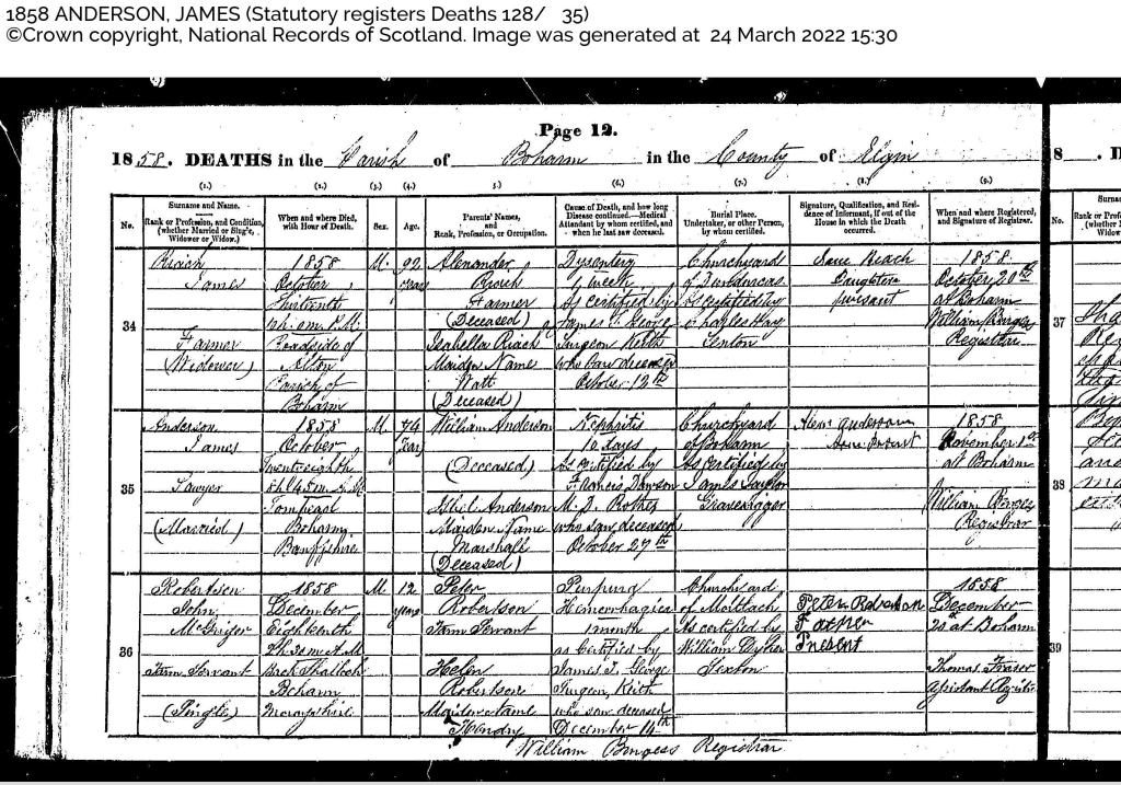 [vii] 1858, Anderson, James (Statutory registers Death 128/35), ©Crown copyright, National Records of Scotland. Accessed on scotlandspeople.gov.uk, 24 Mar 2022.