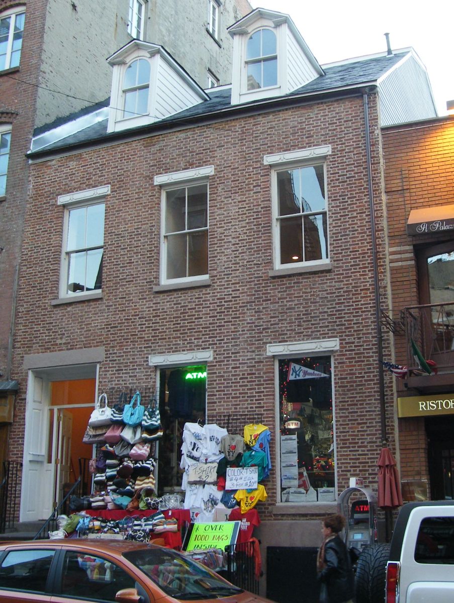 “149 Mulberry Street (c. 1816), designated as the Stephen Van Rensselaer House, 1969.  This brick-faced, wood-frame house exemplifies the small row houses in the Federal style that were once common in Manhattan south of 14th Street.  The Flemish bond brickwork, paneled stone lintels, gambrel roof, and dormer windows are characteristic of the style.  The house was one of many in the area erected by Stephen Van Rensselaer; it was originally located on the northwest corner of Mulberry and Grand Streets, and was moved in 1841.” [xvii]