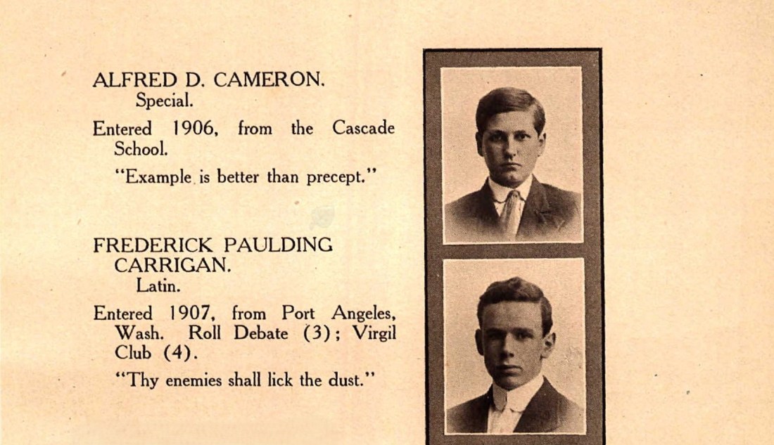 [ix] I rather like the maxim included for another student, Frederick Paulding Carrigan: “Thy enemies shall lick the dust”, which was taken from Psalms 72, verse 9 KJV. I don’t have enemies, but if I did, I’d want them to visit when it was time for spring cleaning. Yes, okay, it actually means my enemies will go down to defeat, but I still like my initial interpretation.